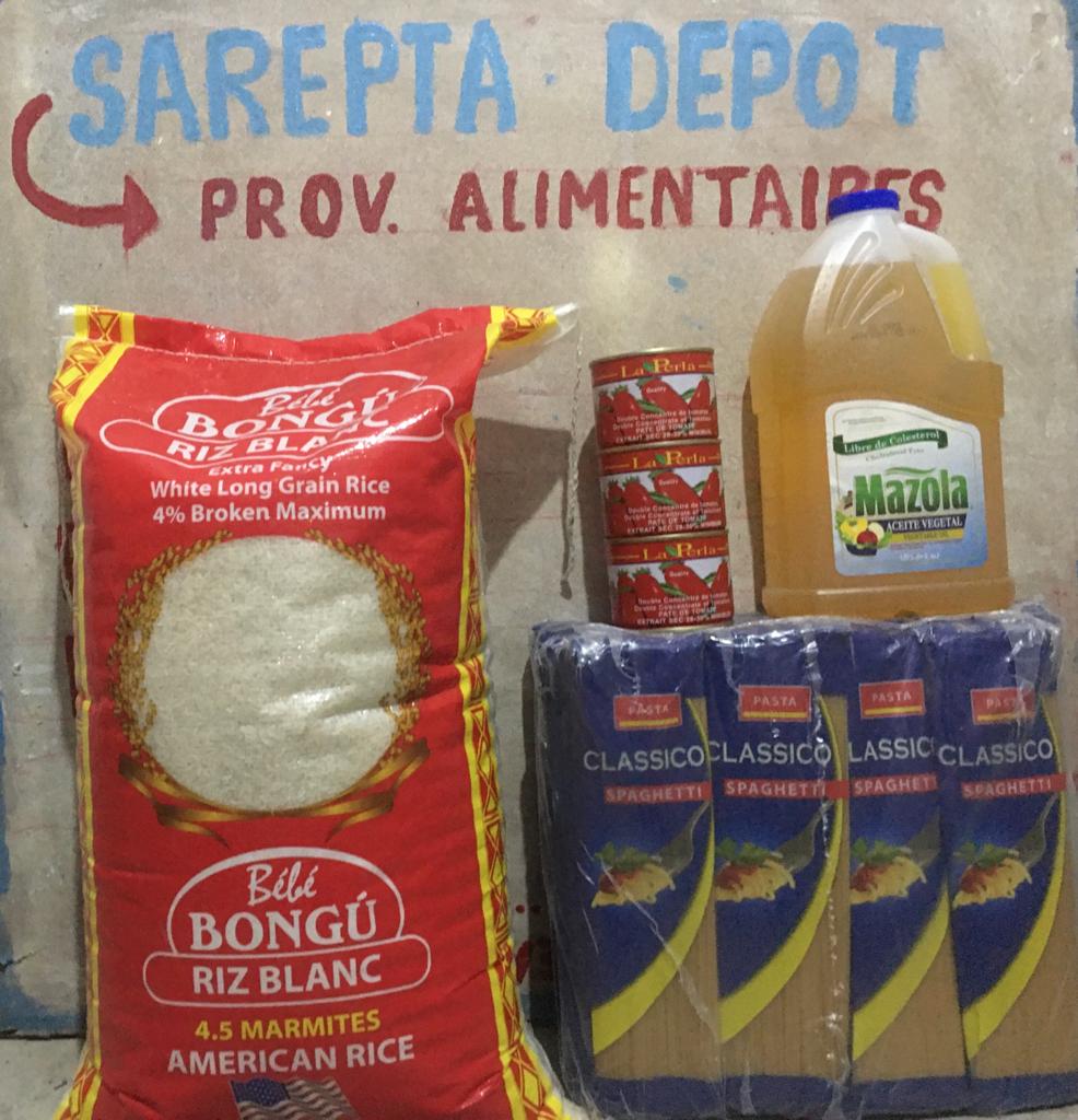 Sac de riz 12.5kg, huile végétale 1.89l, caisse de spaghetti 24 pqt/100g, pâte de tomate 3 boîtes/210g, frais de livraison inclus.